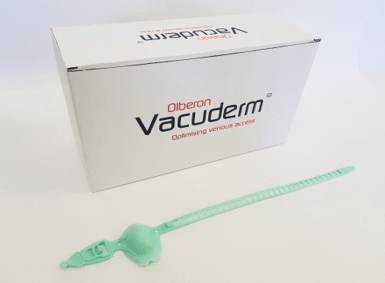 The Vacuderm is a single-use tourniquet, incorporating a dome which creates a negative pressure to distend the vein local to the intravenous access site. Designed to aid intravenous needle insertion for cannulation, blood collection and drug delivery.